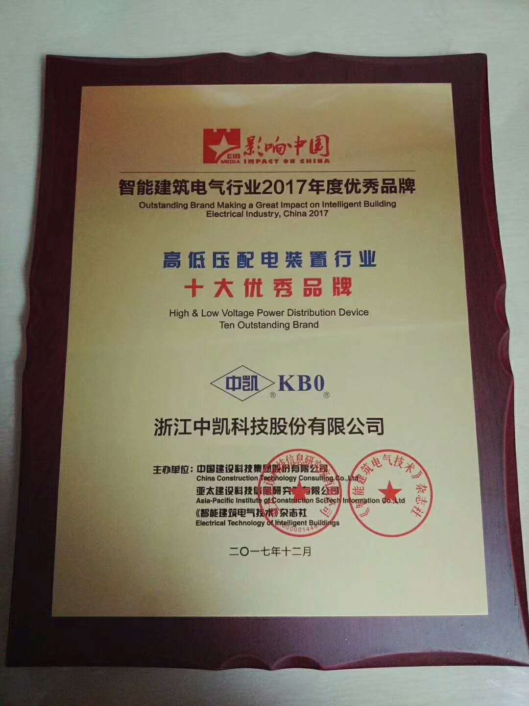 20171219日,從北京傳來好消息,我浙江中凱科技股份有限公司再次被評選為2017年度影響中國智能建筑電氣行業高低壓配電裝置十大優秀品牌,這是我公司自2016年以來,連續第二次獲此殊榮。本次評選的2017年度高低壓配電裝置十大優秀品牌分別由浙江中凱和ABB、施耐德、西門子、常熟開關等業內十家領軍企業斬獲。