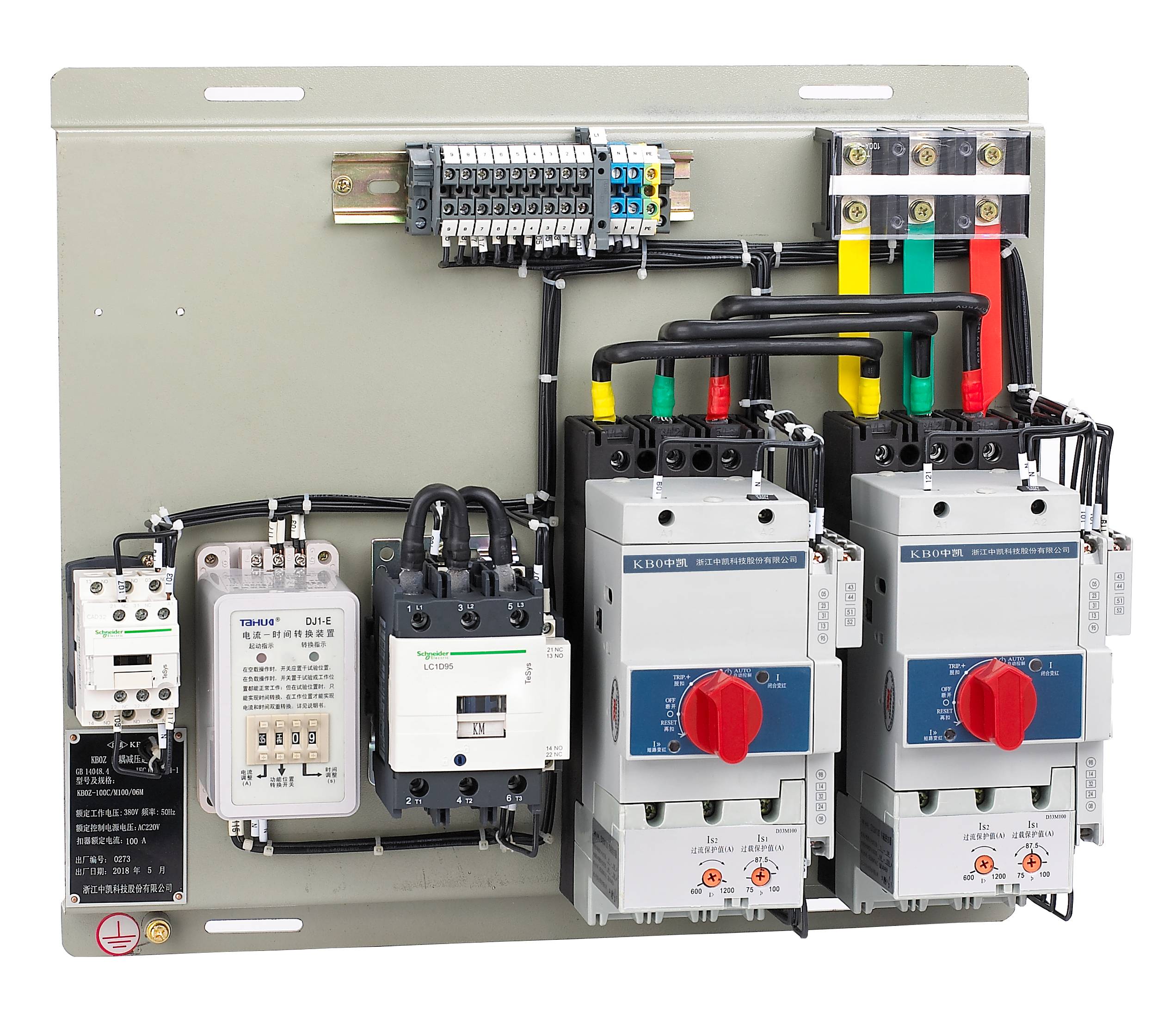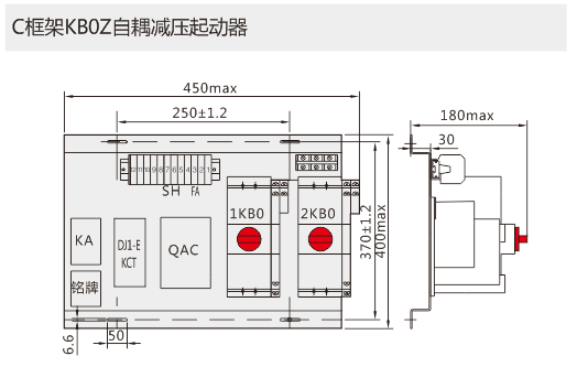 KB0作為主開關,與接觸器、時間電流轉換裝置、電氣聯鎖等附件組合,構成自耦減壓起動器成套單元KB0Z(以KB0-F消防型產品作為主開關,可構成消防型自耦減壓起動器成套單元KB0Z-F)可實現110kW及以下的電動機的自耦減壓起動控制與保護。