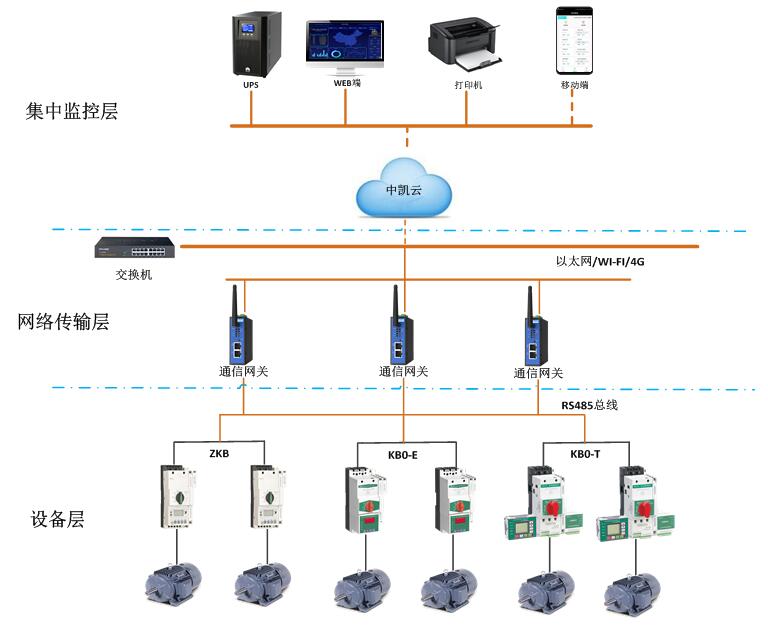 基于中凱物聯(lián)網(wǎng)云平臺的電動機智能監(jiān)控系統(tǒng),以可通訊KB0作為電機控制與保護的核心元件,并實時采集電動機數(shù)據(jù)包括:實時電流、實時電壓、故障信息、整定參數(shù)等,通過中凱智能網(wǎng)關(guān)上傳至中凱云平臺。