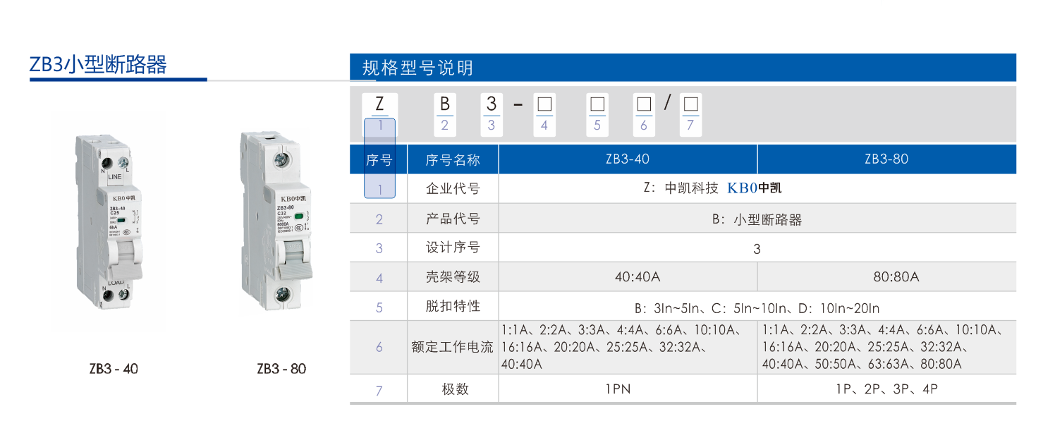 ZB3小型斷路器具有觸頭位置指示窗口,帶觸指防護組合型接線端子及紅綠安全指示,安全性更高。限流型觸頭系統,磁吹型滅弧裝置,確保高分斷能力,避免產品與設備承受大的短路電流。殼體與功能鍵均采用高性能PA尼龍(高阻燃、耐高溫、耐沖擊)塑料制成。外形新穎、結構合理,具有多項專利保護。產品具有過載、短路保護功能。